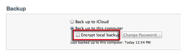 – Make sure that the ‘back up’ does is not encrypted – uncheck the checkbox “Encrypt Local BackUp” in the main window in iTunes