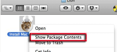 This brings up a Contents folder, from here navigate to Contents/Shared Support/InstallESD.dmg, and thats the disk image to burn, it contains all the goodies.
