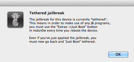 A tethered boot on the other hand requires software to restart the jailbroken device to continue to use it in its jailbroken state – you can restart the device without the assistance of redsn0w but it loses its jailbroken functionality.