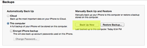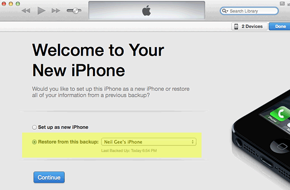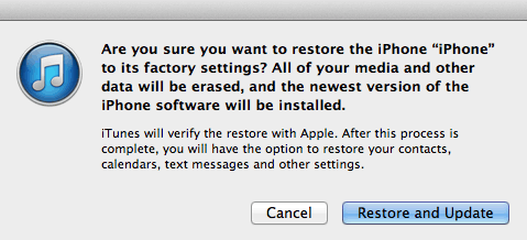 If you tried the upgrade button and the process fails – you will be offered a restore – which will restore the iphone to factory settings but at the latest iOS – this will more than likely happen on a previously jailbroken iPhone. Click on restore and update. Then you will be prompted to restore the last data back up.